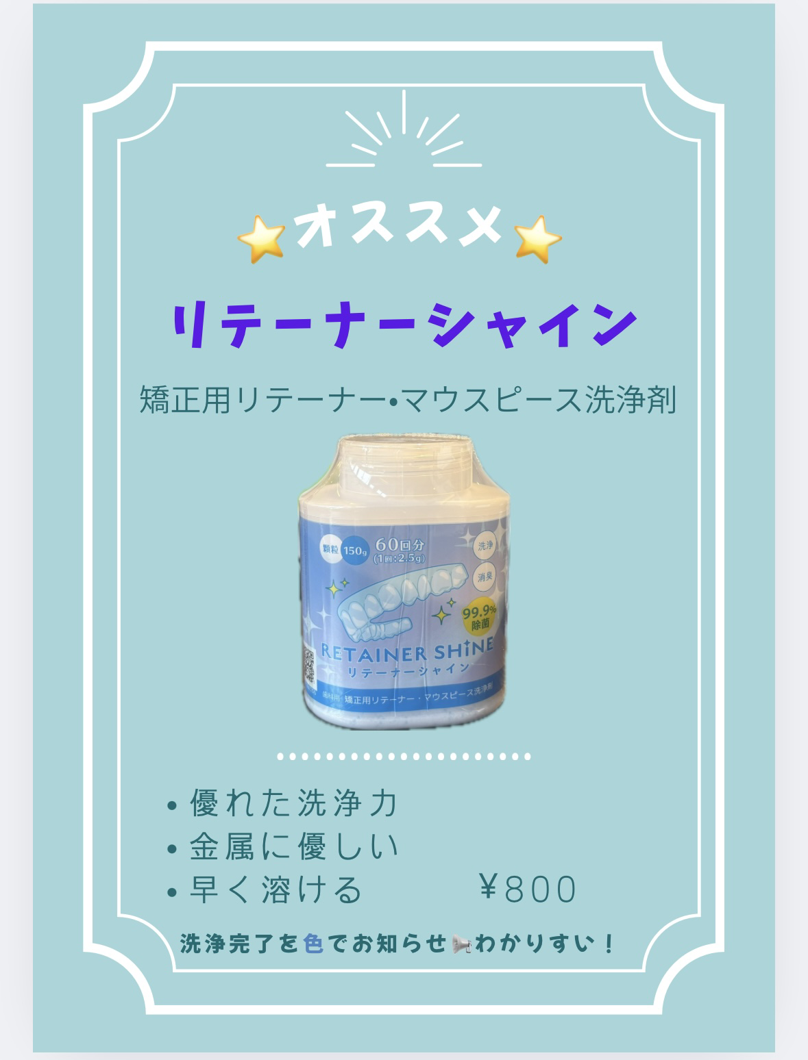 【リテーナーシャインがリニューアル】 矯正後のリテーナーやマウスピースの洗浄剤「リテーナーシャイン」が、新しくなって登場しました! すぐに溶けてしっかり除菌タンパク分解酵素+活性酸素のW洗浄金属部分にもやさしく、安心して …