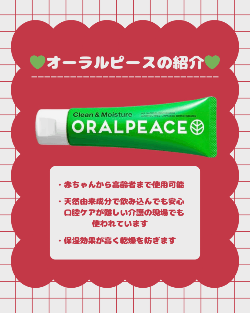やさしく潤いを与えながら清潔を保てるオーラルピース、気になる方はスタッフまでお気軽にお声がけください