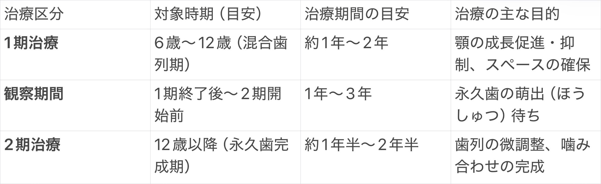 子供の矯正治療は、大きく分けて「1期治療(骨格矯正)」と「2期治療(歯列矯正)」の2つのステップに分かれます。これらは開始時期や目的が明確に異なり、治療期間にも違いがあります。