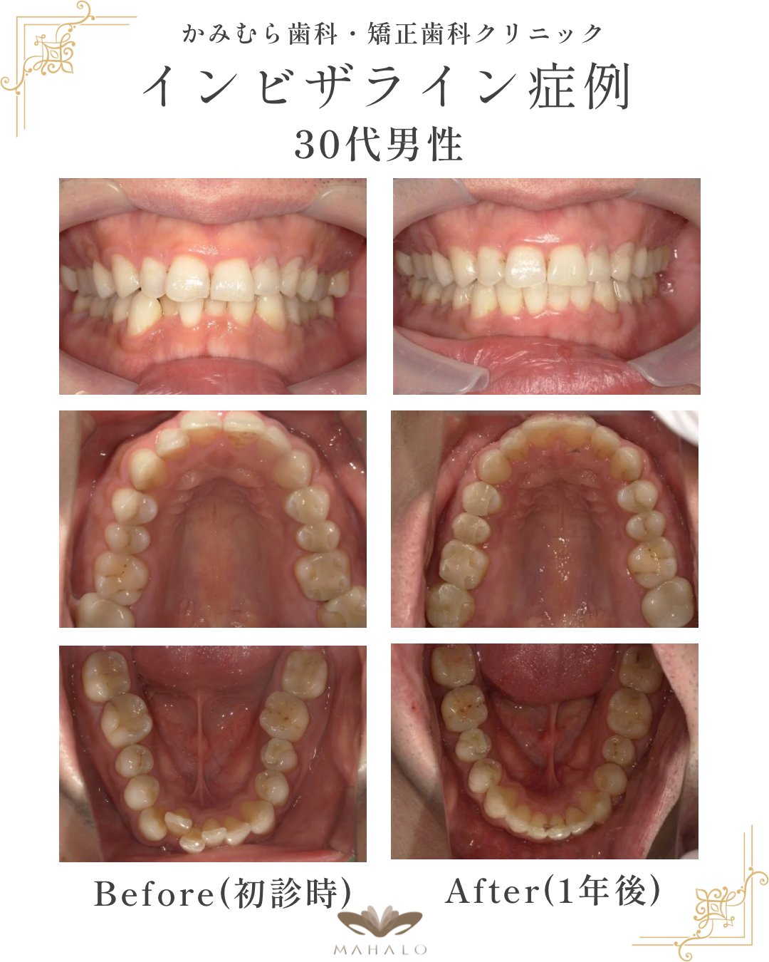 30代の男性患者様は、お仕事の都合上「装置が目立たないこと」を重視されるケースが多く、インビザラインは非常に満足度の高い選択肢となります。今回の症例では、約1年という比較的短期間で健康的な歯並びを実現できました。
